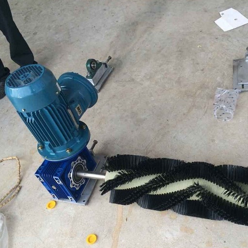 新型电动旋转式滚刷清扫器由防爆电机、减速机、清扫滚筒、联轴器、轴承座、调节架组成。